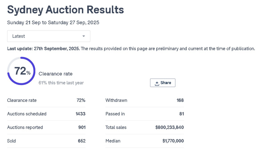 Sydney Auction Results Sunday 21st - Saturday 27th Sep, 2025
