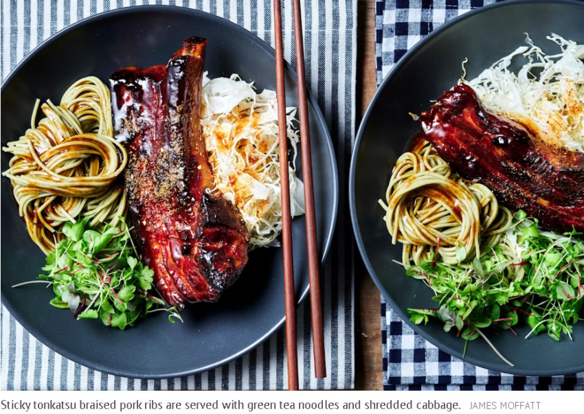 Pork ribs are baked in a complex and aromatic liquid that transforms into a glossy, sticky glaze. They’re served alongside a tangle of earthy green tea noodles, cabbage, and baby salad leaves to cut through the richness.